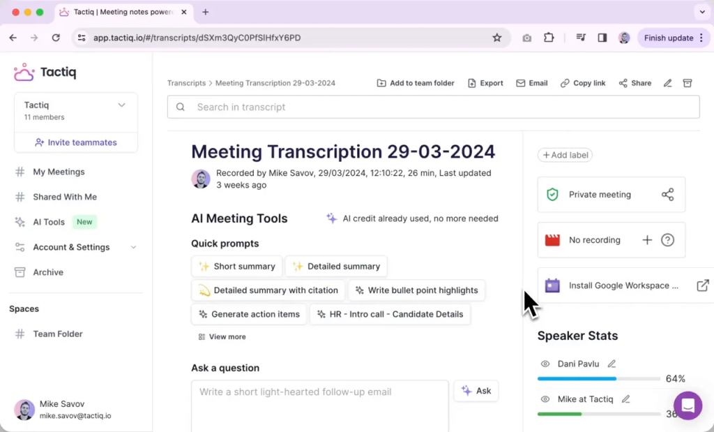 - Fast meeting transcripts: Tactiq quickly captures what was said so you don’t have to take manual notes.