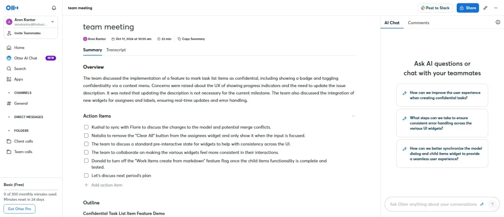 Otter delivers real-time, readable live transcription with live captions inside Zoom, Google Meet, and Microsoft Teams. Its standout Otter AI Chat lets you ask questions mid-call – things like “What were my action items?” or “Summarize the budget decision” – and it pulls answers straight from the conversation. Teams can simultaneously access, annotate, and comment on the transcript, creating shared understanding without post-meeting lag. You can also upload pre-recorded audio or video to transcribe, and review on the go with a solid mobile app.